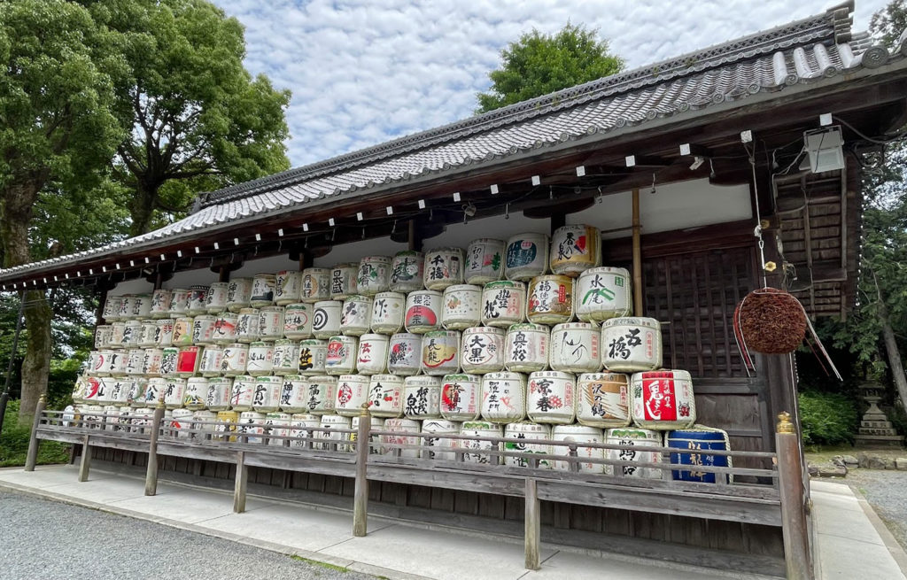 松尾大社はお酒の神様を祀る神社です。そのため、境内にはお酒の瓶や酒樽がたくさん並んでいました。正月ならではの華やかな雰囲気を感じることができます。
