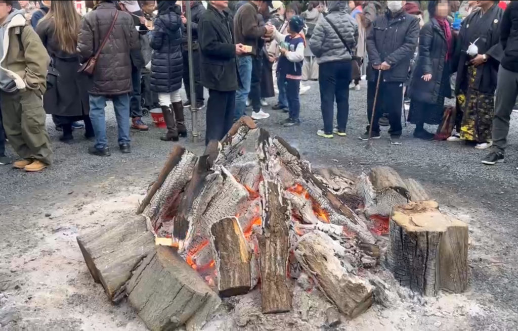 境内には篝火(かがりび)が焚かれていました。周囲は暖かく、人がその火を囲み、とてもあたたかい空気感でした。